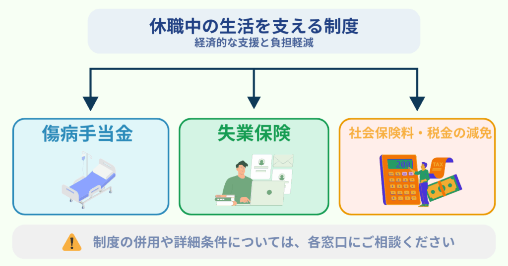 休職中の生活を支えるため、日本には複数の公的制度が用意されています。