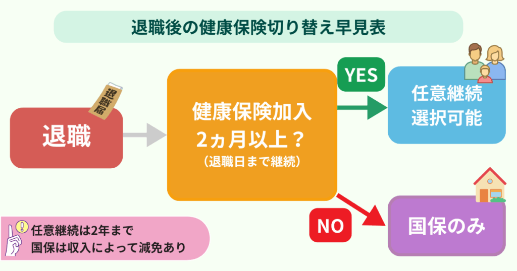 退職後の健康保険は「任意継続被保険者制度」か「国民健康保険」に加入するかを選択する必要があります。
