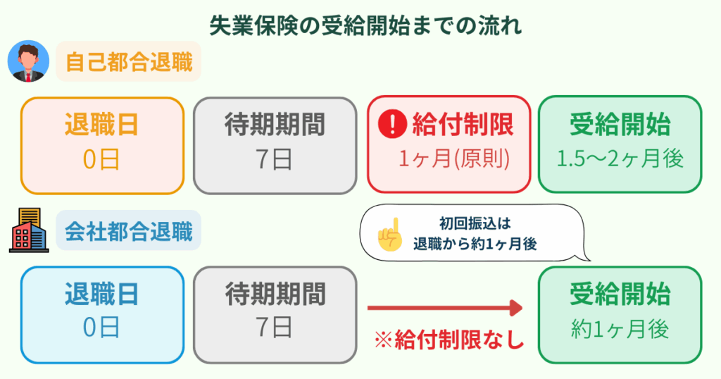 - 自己都合退職の場合:7日間の待機期間に加えて、原則1ヶ月の給付制限があるため、実際に振り込まれるのは退職から1.5〜2ヶ月後