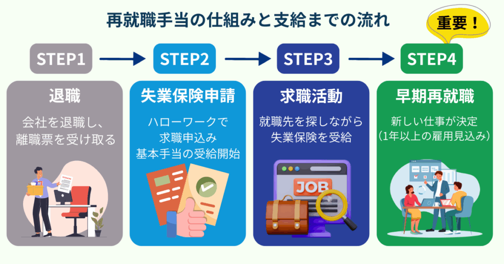 退職 ⇒ 求職申込み ⇒ 7日間の待機期間 ⇒ 受給資格決定 ⇒ 内定 ⇒ 入社 ⇒ ハローワークへ報告