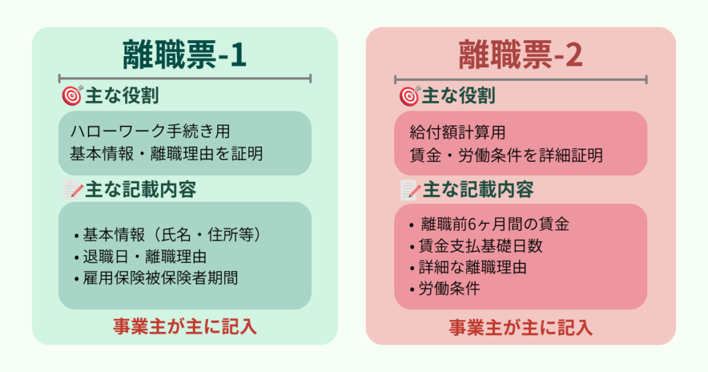 離職票は、通常「離職票1」と「離職票2」の2枚セットで交付されます。この2枚は、それぞれ異なる役割を持っており、どちらも欠かせません。