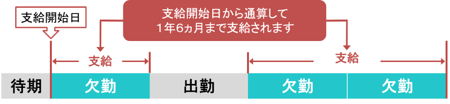 | 一時復職→再発 | 支給期間は「通算」扱い。復職していた期間はカウントがストップし、支給期間が温存。再発して再び休んだ日から、残りの期間分の支給が再開される。 |