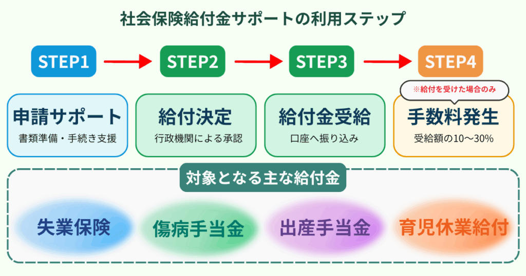 そんなときに利用されるのが「社会保険給付金サポート」と呼ばれるサービスです。専門スタッフが申請を支援してくれることで、取りこぼしなく給付を受けやすくなります。