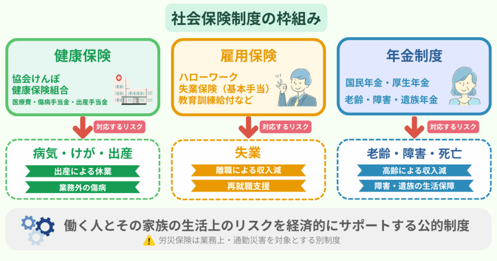 医療保険(協会けんぽや健康保険組合)、雇用保険、年金制度によって構成されており、それぞれが失業・病気やけが・出産・老齢・障害・死亡といったリスクを補います。