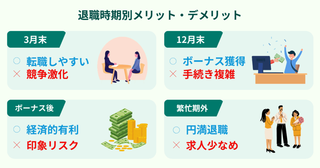 退職時期によるメリット・デメリットを把握しておくと、計画的に辞めるタイミングを選びやすくなります。