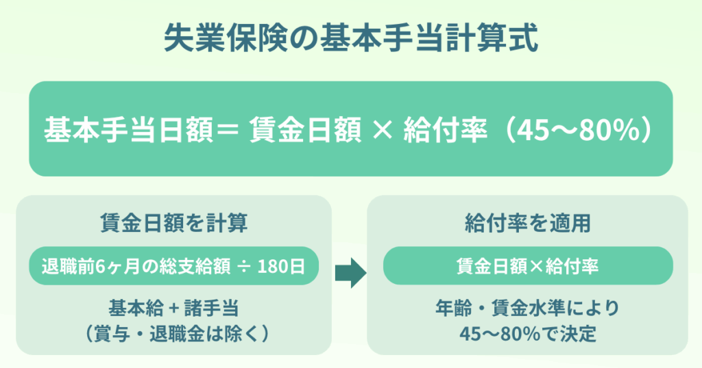 「賃金日額」は、原則として、「退職前6ヶ月間の給与(賞与などは除く)の合計÷180日」で計算されます。「給付率」は、賃金日額や年齢によって異なり、賃金が低い方ほど高い給付率(最大80%)が適用される仕組みです。