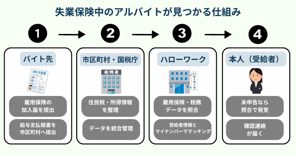 アルバイト先で雇用保険に加入した場合、その情報は自動的にハローワークに届きます。受給者のデータと照合されることで、同一人物であることが確認され、就労の事実が把握される仕組みです。